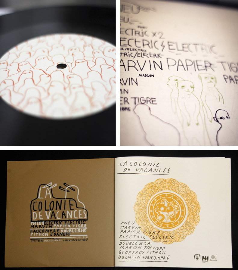"La Colonie de Vacances" Co-éditeurs : Kythibong et Murailles Music. « La Colonie de Vacances » est une expérience de concert hors du commun où le spectateur est balloté entre quatre scènes occupées par quatre groupes français références du rock-noise : Electric Electric, Marvin, Papier Tigre et Pneu. Double Bob, Marion Jdanoff, Quentin Faucompré et Geoffroy Piton se sont appropriés cette expérience en accompagnant les musiciens de « La Colo » en tournée. Le résultat, autant sur le papier que dans les tracés du disque, est une somme d'impressions des quinze artistes lors d’une tournée pas comme les autres, celle d’une vraie colonie de vacances. |