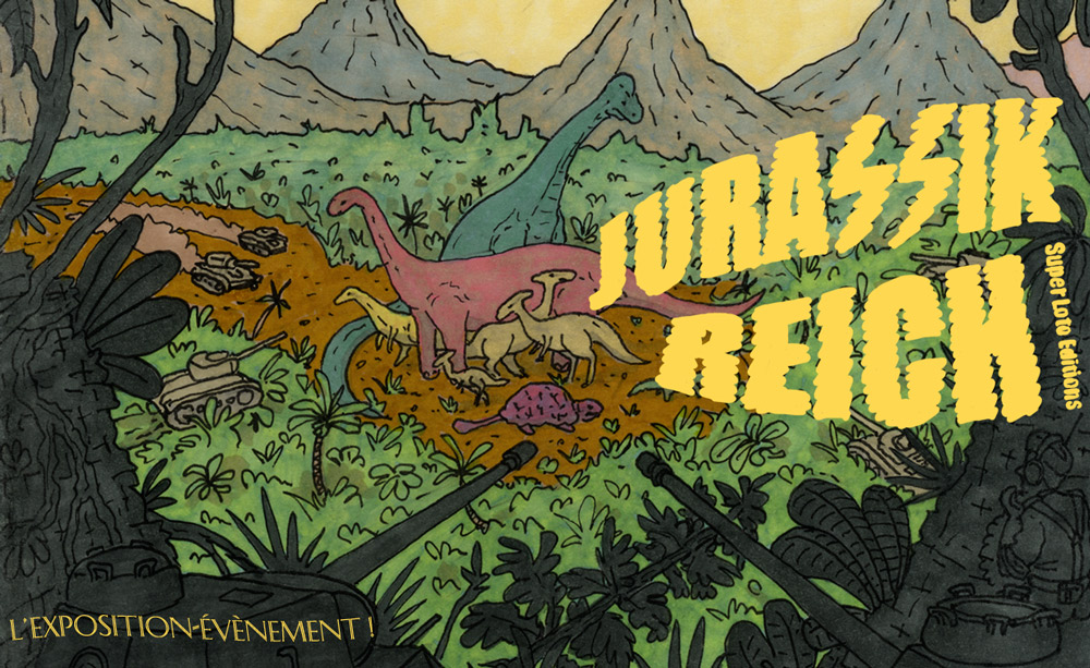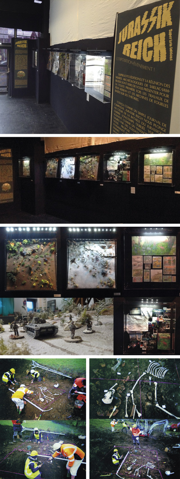 "Jurassik Reich" « Jurassik Reich » est une exposition autour du livre éponyme de Félix Kerjean, paru chez Super Loto Éditions en 2017. Elle prend comme postulat la fabrication de toutes pièces d’une théorie du complot, celle fantaisiste de la prétendue contemporanéité entre des nazis et des dinosaures. Si le livre est un catalogue de belles images et pages de bandes dessinées muettes montrant des scènes de massacre de dinosaures par des soldats nazis, mais aussi de pseudos moments de la vie quotidienne et de nombreuses références à des chefs d’ oeuvre de la peinture et sculpture du XXème siècle, l’ exposition prend les oripeaux d’une présentation d’un musée archéologique : en vitrines sont exposés les originaux de l’ artiste, des maquettes comme autant de reconstitutions historiques à l’échelle 1/72ème, et une vitrine de fausses archives de fouilles archéologiques (composée d’un plan de coupe, de petits artefacts et de photographies argentiques de vraies fausses fouilles archéologiques réalisées pour l’occasion). Idée originale, conception et commissariat : Super Loto Éditions (Camille Escoubet). Exposition à louer, contacter contact.sleditions@gmail.com.