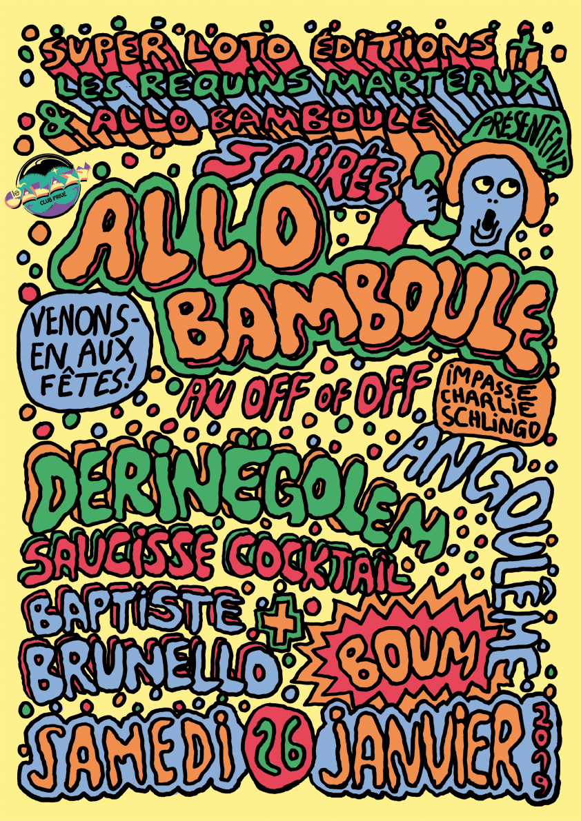 Super Loto Editions et Les Requins Marteaux Éditions ouvrent leur boutique à Angoulême durant le FIBD face à l’ESPACE FRANQUIN ! - LIVRES - Stands de livres des deux maisons d’édition. - EXPOSITIONS - « Au-delà du Raël » de Cizo « Varicia Nueva » de Pipo Color, Mathieu Jiro et Thi Kim Thu (planches originales, affiches en riso et surprises) « Atomic Love » de Jiro Ishikawa (fac-similés) Jeudi 24 janvier: Vernissage des expositions à partir de 18h. -DÉDICACES- Les horaires des dédicaces peuvent évoluer. JEUDI 15h-17h : Félix Kerjean et Pipocolor VENDREDI 11h-12h30 : Stanislas Moussé 14h-16h : Félix Kerjean et Oudin Ojjo 15h30-16h30 : Sébastien Lumineau 16h-17h : Bastien Vivès 17h-18h : Delphine Panique, El don Guillermo, Bouzard SAMEDI 11h-12h30 : Stanislas Moussé et Félix Kerjean 12h15-13h30 : Edmond Baudoin 14h-16h : Pipocolor 15h30-17h30: Winshluss et Éric Salch 16h-18h : Aurelie William Levaux et Stanislas Moussé DIMANCHE 11h-12h30 : Oudin Ojjo 14h-16h : Aurelie William Levaux et Félix Kerjean 16h-18h : Laurent Bourlaud et Vincent Fortemps (Moondog) -CONCERTS- Hammerhead Sharks Attack, Noise from Mars Vendredi 25 janvier à partir de 21h30 Concert organisé par Les Requins Marteaux Éditions au MARS en partenariat avec La Nef avec King’s Khan Louder Louder Than Death, Arno De Cea & The Clockwork Wizards et Chocolat Billy. 8 euros - Sur place - Pas de prévente -SOIRÉE- Samedi 26 janvier - à partir de 20h - Impasse Charlie Schlingo. Allo Bamboule, organisée par Super Loto Editions et Allo Bamboule, en partenariat avec Les Requins Marteaux Éditions avec DERINËGOLEM, Saucisse Cocktail et Baptiste Brunello LES CONCERTS ET SOIRÉES N’AURONT PAS LIEU DANS LA BOUTIQUE. Crédit image : Cizo (Le Galaxy) et Vincent Wagnair (Allo Bamboule) |
