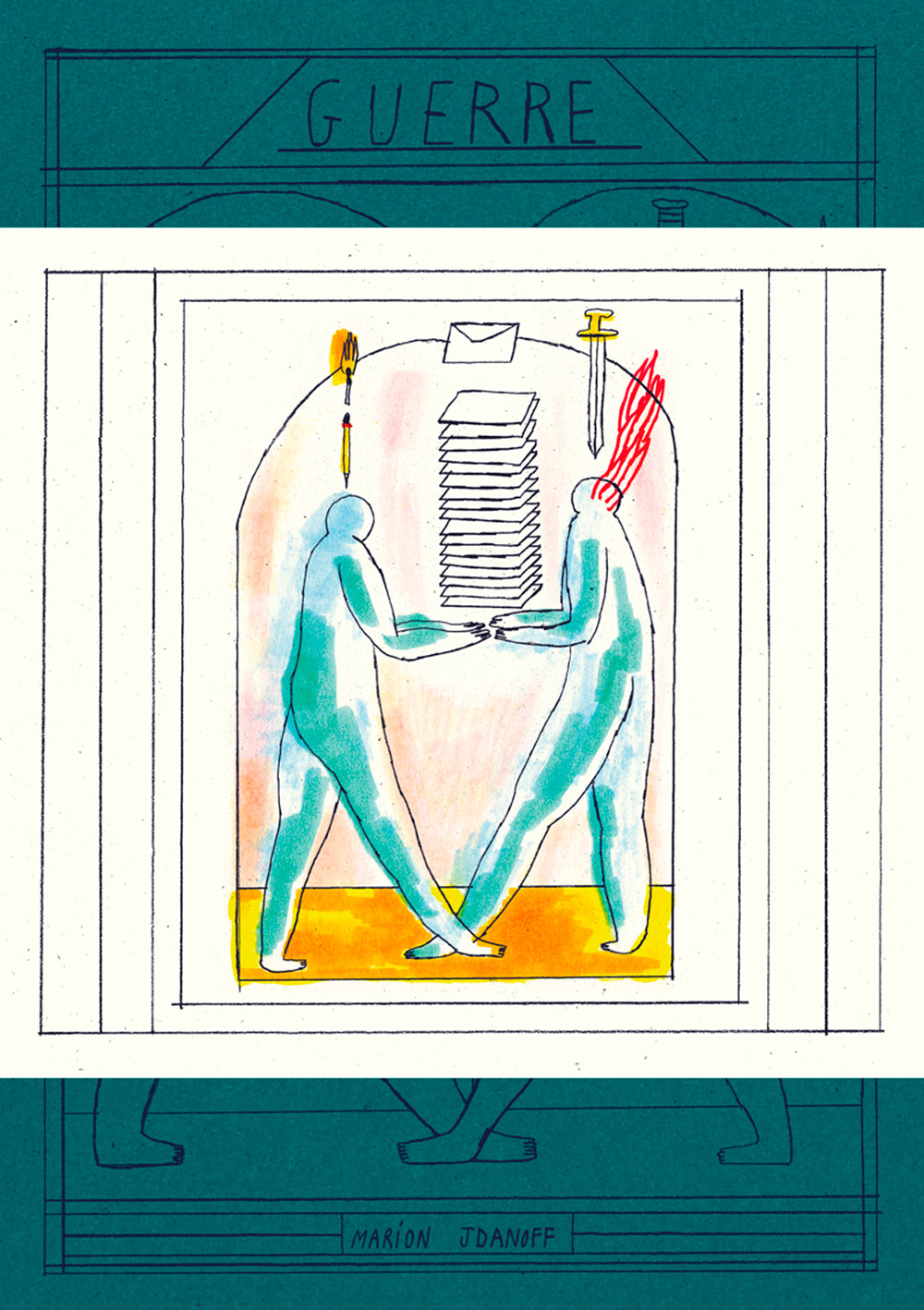 Sorte de bande dessinée de 78 pages, impression offset (même si le livre est jalonné de gaufrages réalisés sur des presses typographiques), carré-collé, 16,8 X 22,5 cm. 14€. |